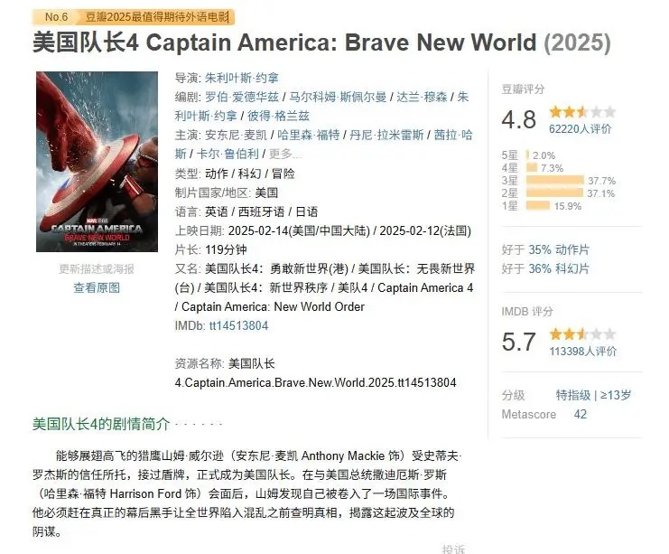 《好意思国队长 4》于 2025 年 2 月 14 日在中国内地(同步北好意思)上映,该片是继《猎鹰与冬兵》剧集后,山姆・威尔逊正经接任好意思国队长盾牌的首部寂然电影。
