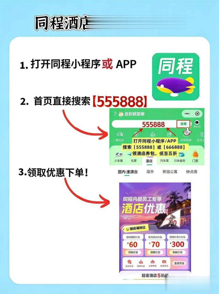 在同程小才调搜【惊喜100】【惊喜888】【555888】【666888】,即可领取酒店民宿通用大额优惠。