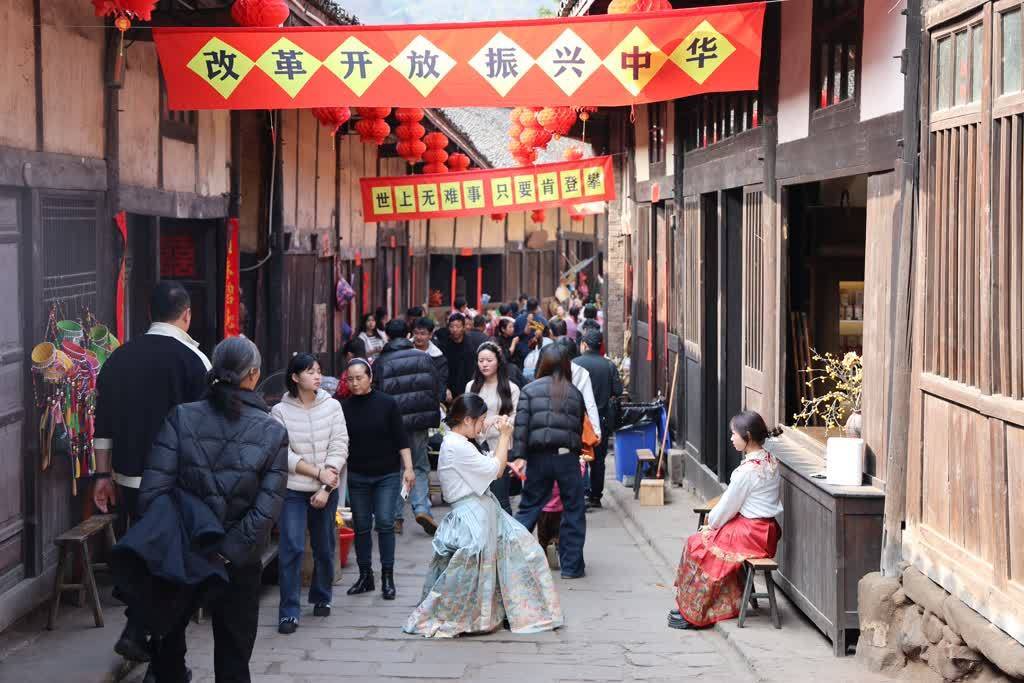 谈及古镇这番新快活,古蔺县旅游景区党工委副文书、管委会主任刘贞春先容,太平古镇通过系统狡计、周全部署,集合春节旅客特色和景区特色,全心打造怀旧场景与红色千里浸体验,推出相沿巡游、意思互动等特色文旅产物。