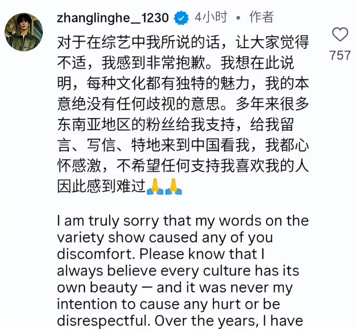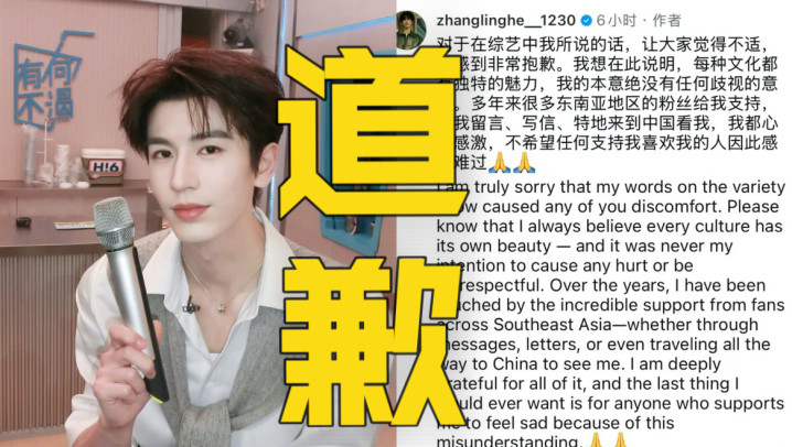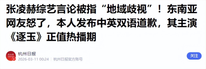张凌赫综艺言论被指“地域懊恼”!东南亚网友怒了,本东谈主发布中英双语谈歉,其主演《逐玉》正好热播期——杭州日报