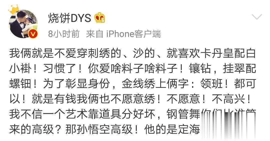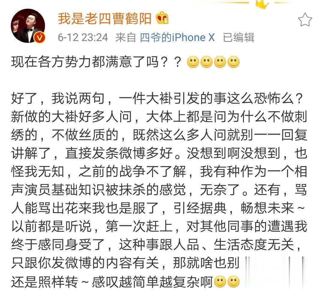 事情的启事是曹鹤阳作念了新大褂,发了大褂科普,于是就有些东谈主说烧饼和曹鹤阳莫得资历也没钱作念刺绣大褂等等之类的话。更有甚者,许多东谈主私信曹鹤阳,问他为什么不穿刺绣大褂省略暗纹大褂,是级别不够也曾重量不及。然后曹鹤阳发微博科普了大褂不分等第的事,成果被黑了。