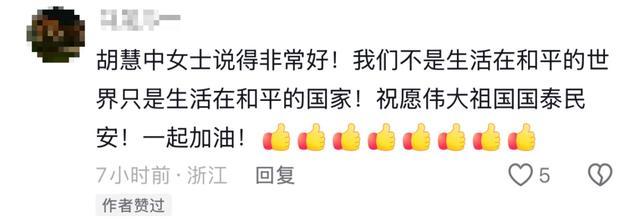 胡慧中暗潮涌动:“我在我的国度里不错摆脱地举止,不错去海边,不错看欢畅。咱们之是以粗略祥瑞地过上小日子,是因为死后有一个宏大的国度在看管着咱们,我心中满怀感德,这即是我的故国中国。”