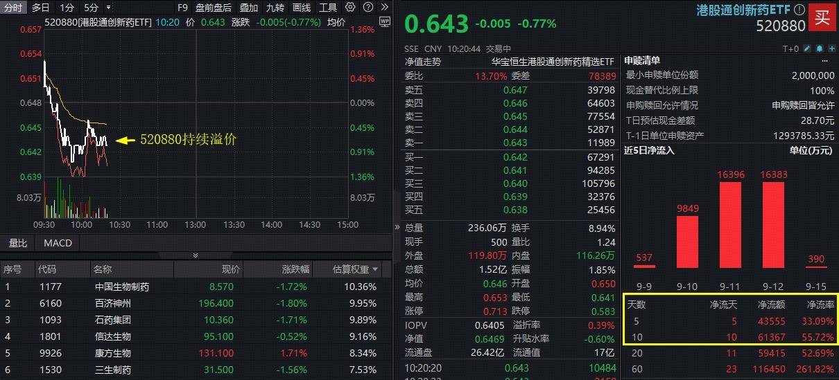 值多礼贴的是,港股通革新药ETF(520880)场内延续溢价往复,走低区间溢价率继续抬升,知晓买盘资金强势。拆伙昨日,520880已连合10日吸金,金额统统超6.1亿元。