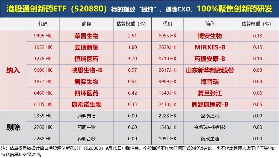 9月8日,港股通革新药ETF(520880)追踪的恒生港股通革新药精选指数“提纯”改造成效,皆备剔除CXO,并精选纳入14家革新药研发类公司,晋级成为“不含CXO、100%聚焦革新药研发”的贞洁革新药指数,精确表征国产革新药硬核力量。