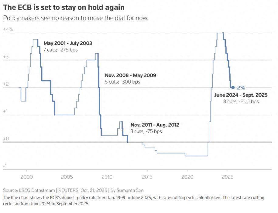 该折线图自满了1999年1月至2025年6月欧洲央行基准入款利率的变化,并标出了每一次具体的降息周期。最新一轮降息周期从2024年6月捏续到2025年9月。
