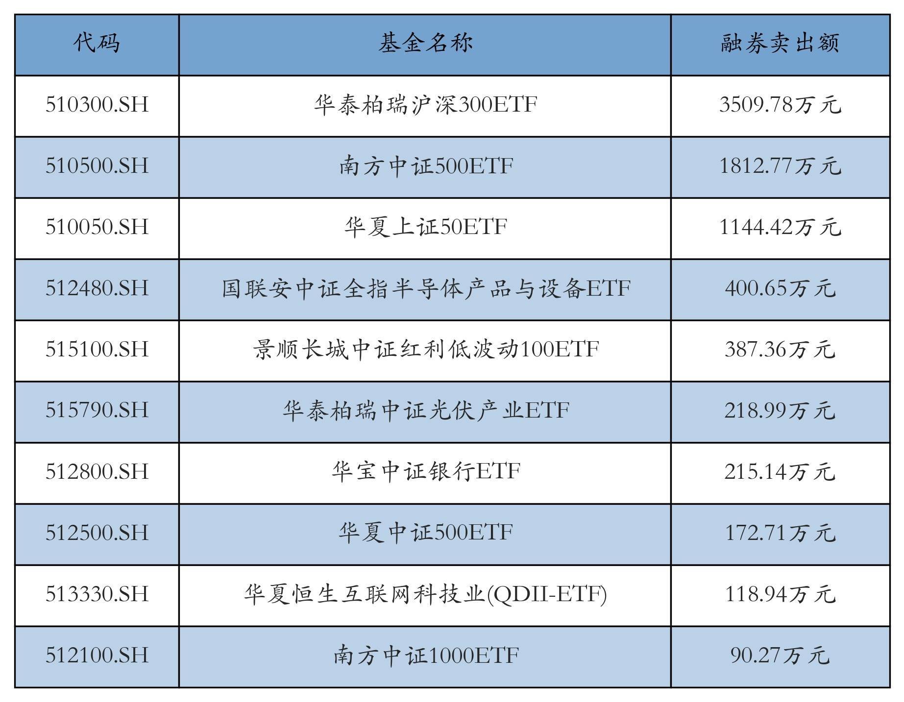 11月10日ETF融券卖出额前三位分手为:华泰柏瑞沪深300ETF(3509.78万元)、南边中证500ETF(1812.77万元)和中原上证50ETF(1144.42万元),前10具体见下表: