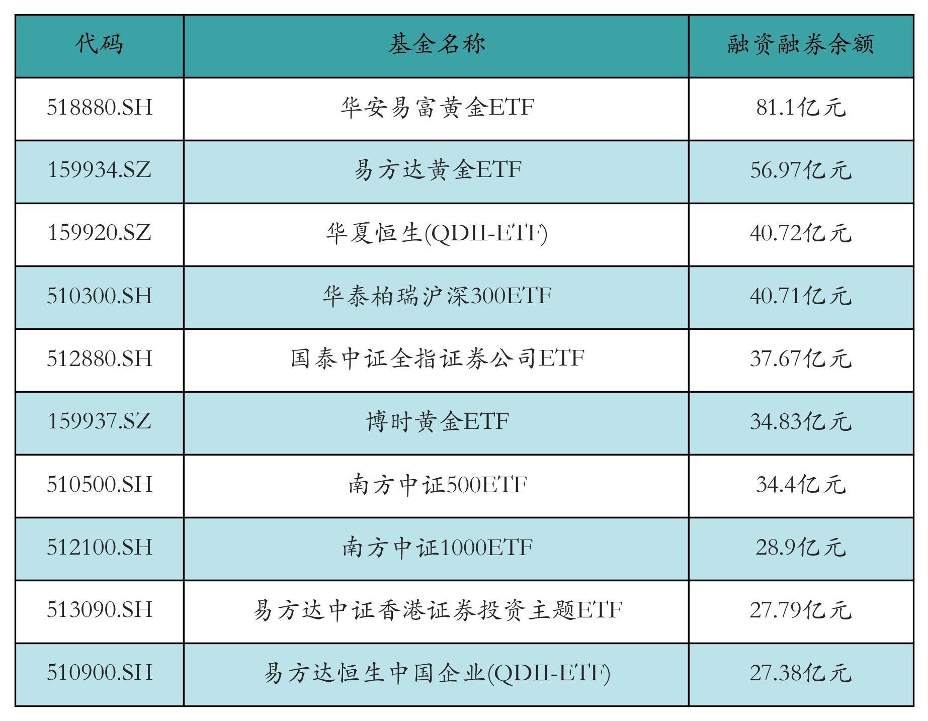 11月10日ETF两融余额前三位分手为:华安易富黄金ETF(81.1亿元)、易方达黄金ETF(56.97亿元)和中原恒生(QDII-ETF)(40.72亿元),前10具体见下表: