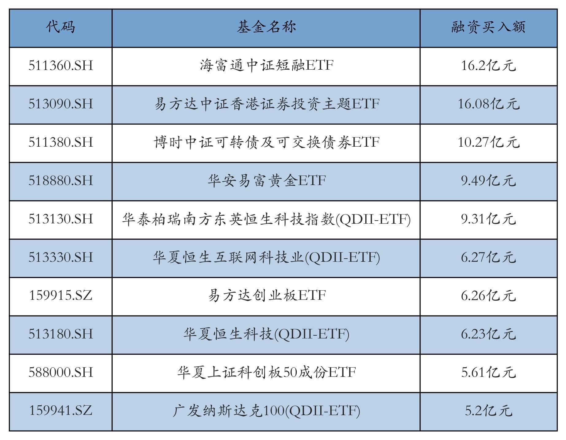 11月10日ETF融资买入额前三位分手为:海富通中证短融ETF(16.2亿元)、易方达中证香港证券投资主题ETF(16.08亿元)和博时中证可转债及可交换债券ETF(10.27亿元),前10具体见下表: