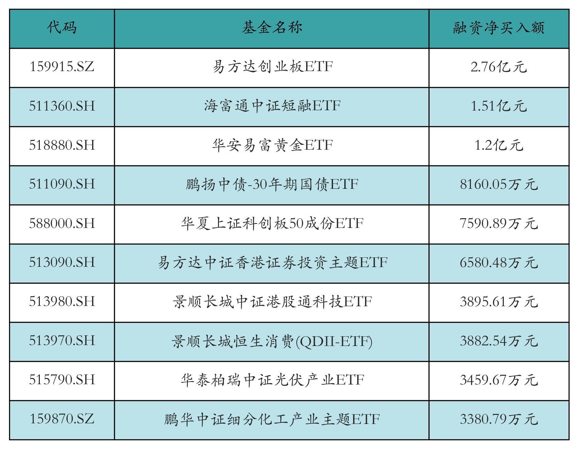 11月10日ETF融资净买入额前三位分手为:易方达创业板ETF(2.76亿元)、海富通中证短融ETF(1.51亿元)和华安易富黄金ETF(1.2亿元),前10具体见下表: